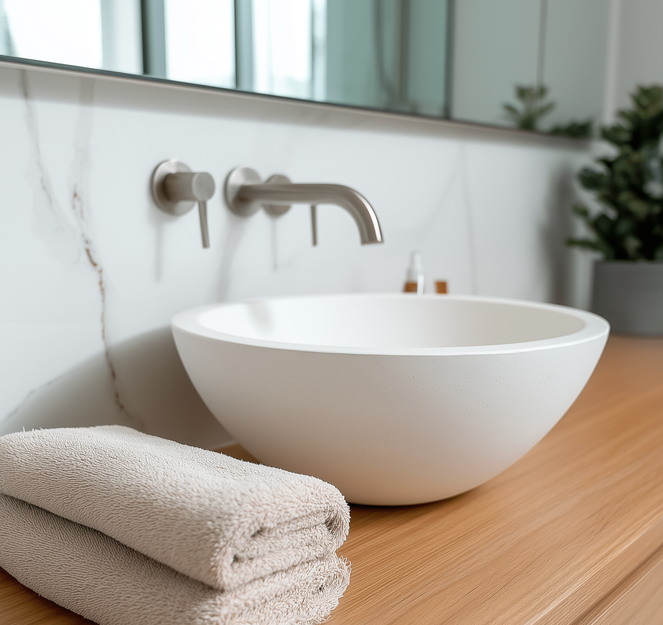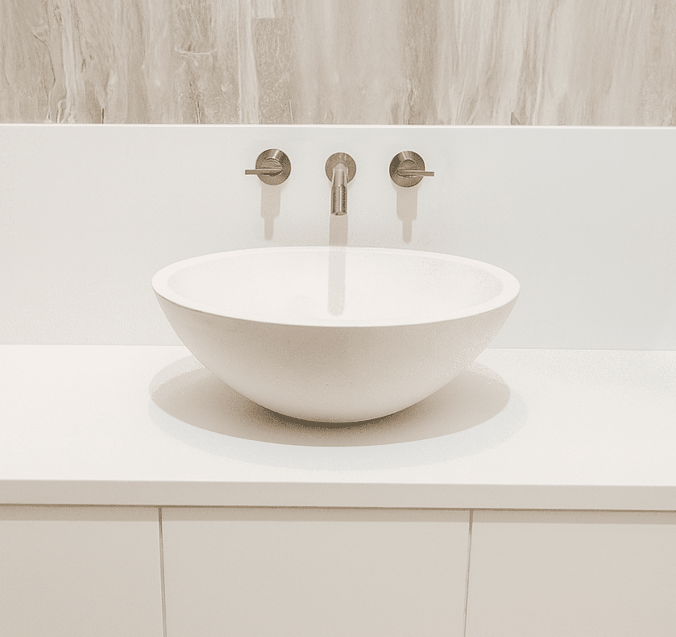 A handcrafted, sealed concrete bathroom sink with a soft matte finish. Ideal for modern vanities or powder rooms. Built from durable GFRC concrete in Michigan.